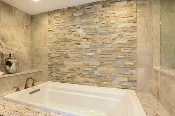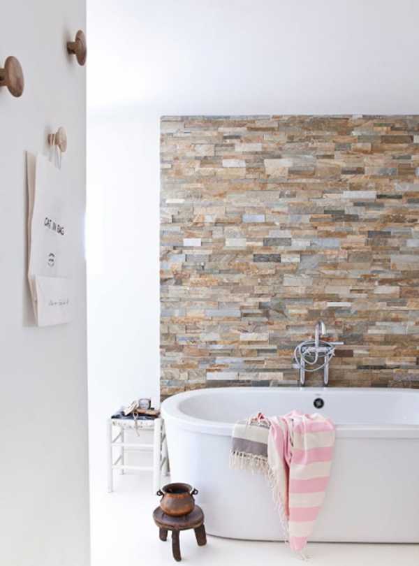 Декоративный камень на стенах, станет более свежей и оригинальной альтернативой плитке или при фрагментарном использовании будет очень гармонично сочетаться с ней, придавая ванной комнате статусности и превосходной защищенности от износа.