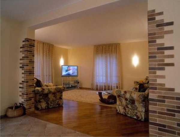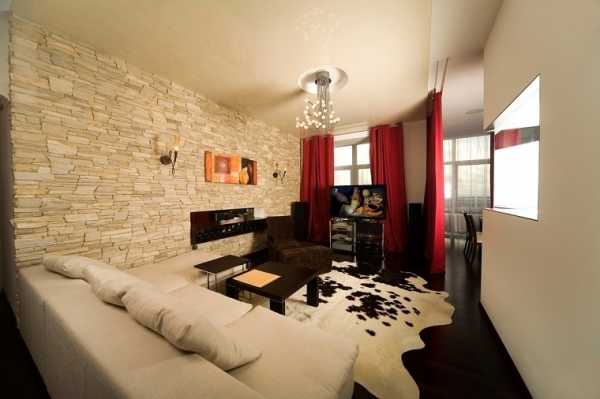Декоративная облицовка, может не только украсить зал, но и при необходимости добиться зонирования пространства. При оформлении данной комнаты нужно в первую очередь обращать внимание на ее габариты и уровень освещения, так как, например, в маленькой гостиной совсем не уместно использование темной и слишком рельефной кладки. В данном случае лучше будет смотреться более гладкая и светлая фрагментарная отделка.