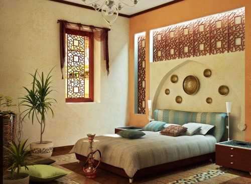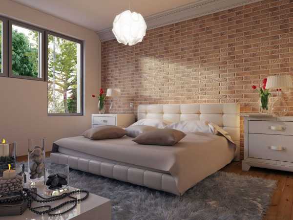 Для этой комнаты подходят теплые тона. Лучшим вариантом будет белый декоративный камень в интерьере. Им можно отделать зону изголовья. Здесь неплохо будут смотреться каменные панно.