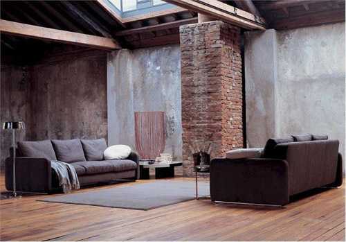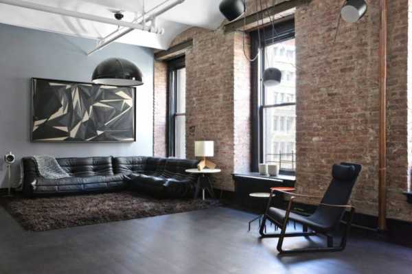 - Лофт. Это один из стилей, наиболее дружных с декоративным камнем. И хотя в изначальном виде лофтовые помещения предусматривают простую кирпичную кладку, можно заменить ее каменной отделкой из серой брекчии либо светло-коричневого плитняка.