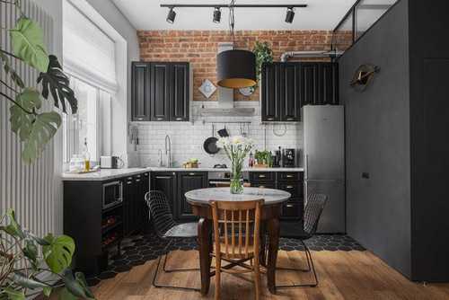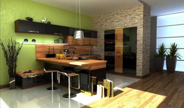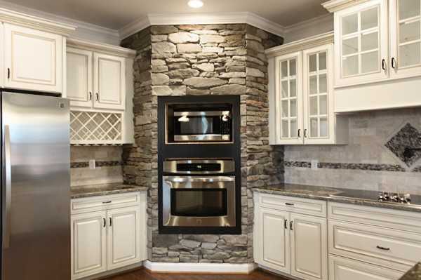 Камнем отделывают проемы дверей, ниши, часть стены, обеденную зону. Но стоит помнить, что камень должен сочетаться с гарнитуром, и соответствовать размерам помещения, если кухня небольшая, берите маленький камень, просторная — большой.