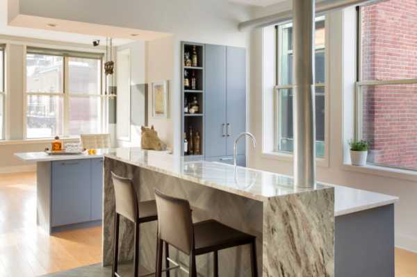 На фото интерьер кухни с барной стойкой из жидкого декоративного камня.