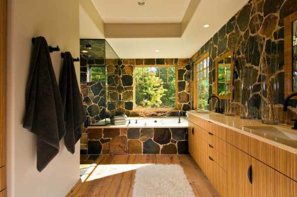 Элементы такого стройматериала составляются без видимых швов, поэтому он смотрится эстетичнее обычной плитки. Обыгрывая в ванной морскую тематику, можно использовать искусственно созданную гальку. Грубый крупный камень хорошо сочетается с элементами из дерева.