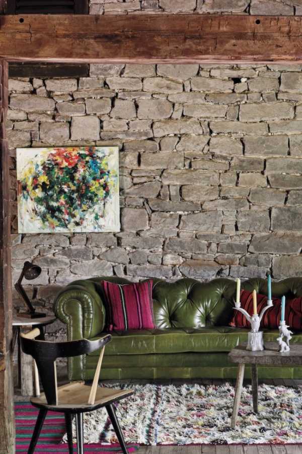 Дикий камень в отделке стены и зеленый «честерфилд» — классические вещи, стильно дополняющие современный интерьер