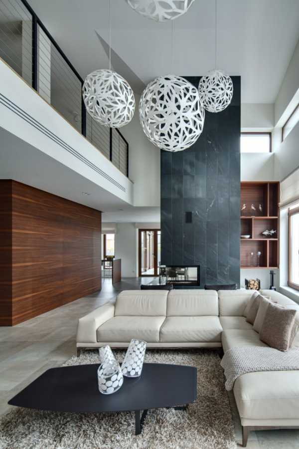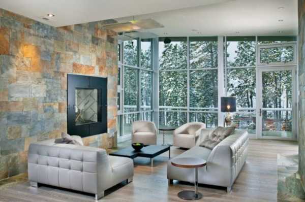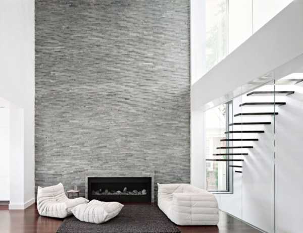 Белый кварцит или песчаник очень освежают интерьер гостиной. Лучше всего такая облицовка смотрится на несущих стенах и над каминами
