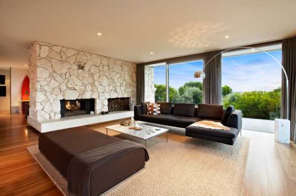 Здесь принимают гостей или устраивают уютные домашние посиделки. Обычно гостиная — самая большая по площади комната. Поэтому камень можно использовать для выделения зон.