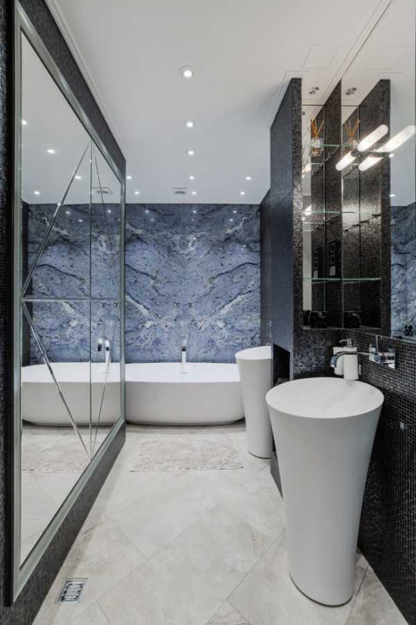 Эксклюзивный дизайн ванной с облицовкой стен слэбами голубого гранита