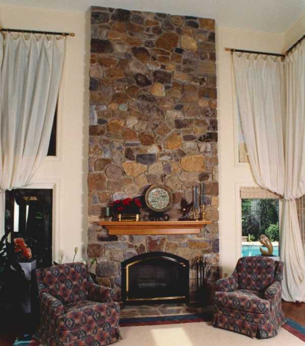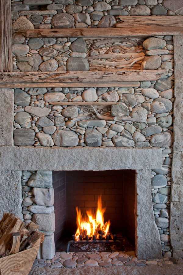 Валуны, галька и дикий камень в оформлении портала традиционного камина