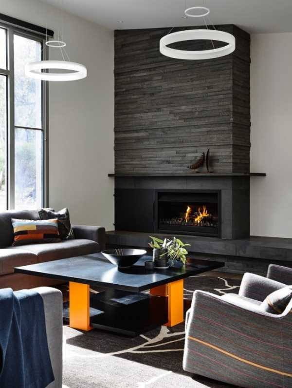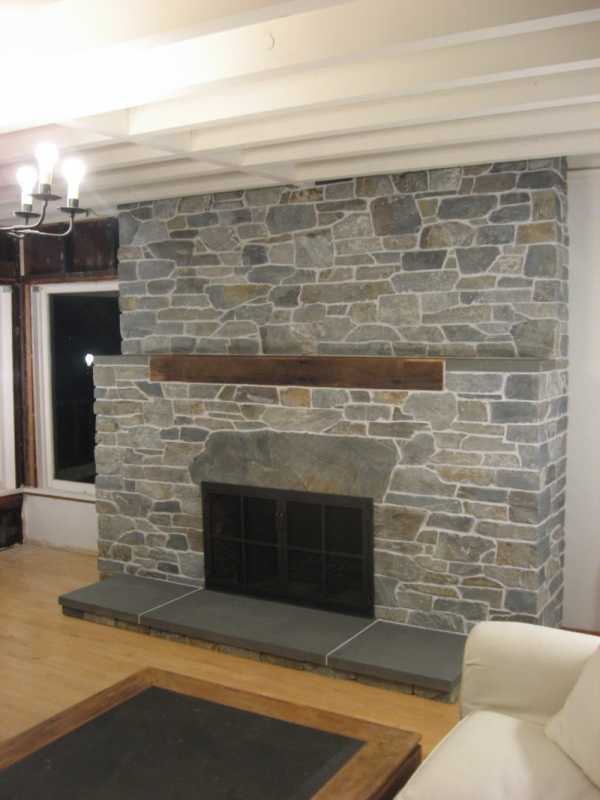 Плитки среднего размера из черного сланца, использованные для облицовки трехстороннего камина