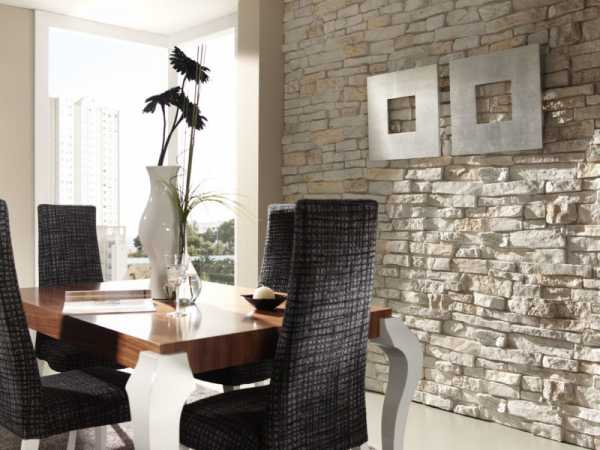 На фото декоративная каменная облицовка светлого оттенка на стене в интерьере столовой.