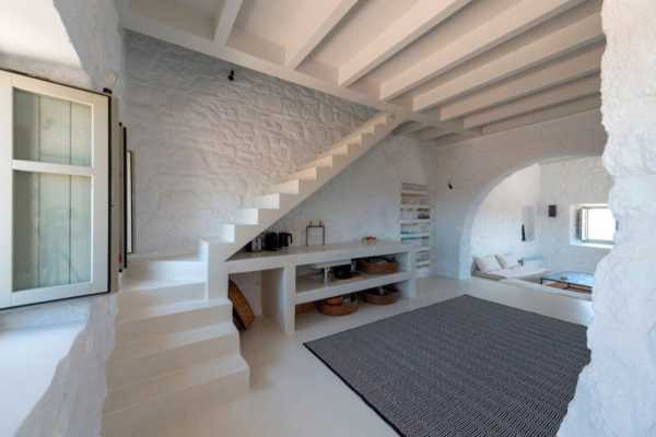 Потрясающий, дышащий свежестью, интерьер с мебелью от B&B Italia (диван Bend Sofa — Патриция Уркиола, кресло Piccola Papilio — Наото Фукасава) и полностью покрытыми декоративным камнем стенами