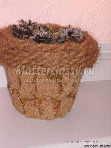 Прекрасно выглядят горшки, декорированные бечевкой. Поверхность горшка покрывается клеем, и бечёвка наматывается аккуратными слоями. Когда она зафиксируется, можно дополнительно выложить узоры либо спирали. Можно украшать горшки отдельными элементами, не покрывая бечёвкой всю поверхность. Эти методы можно взять за основу и всячески экспериментировать, добавляя немного фантазии и получая неповторимые композиции.