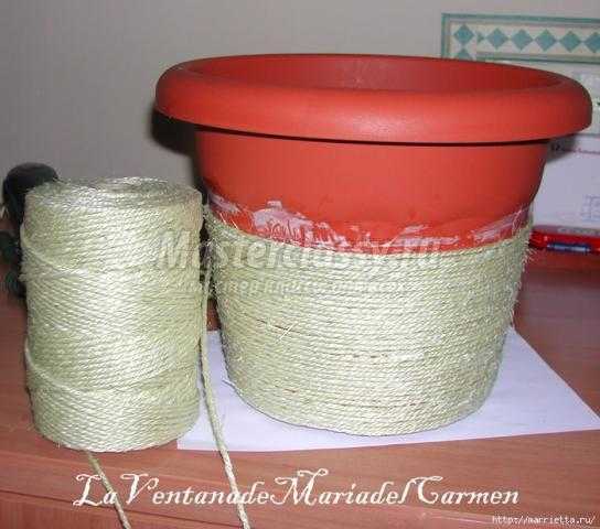 Сизаль — креативное убранство для горшка, да и выполняется несложно. Нужно просто смазать поверхность клеем. Нитями укутывают по кругу, заполняя всю поверхность. Готовый горшок украшают. Для этого можно сплести косу из этих же нитей и приклеить ее к ободку или в другом месте.
