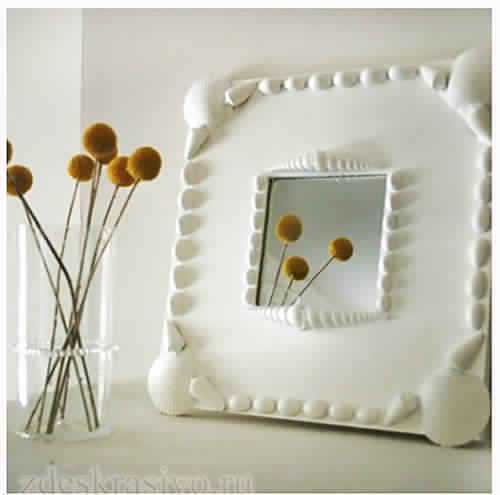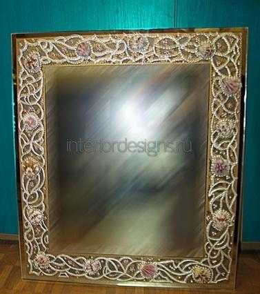 Также можно создать рамку своими руками для зеркала, например, из потолочного плинтуса, созданного из пенопласта. Затем можно без труда украсить ее различными декоративными элементами, такими, как блестки, бусины, ракушки и так далее.