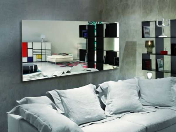 Большим зеркалам прямоугольной формы отводится роль самостоятельных панелей в изголовьях кроватей или за диванами.
