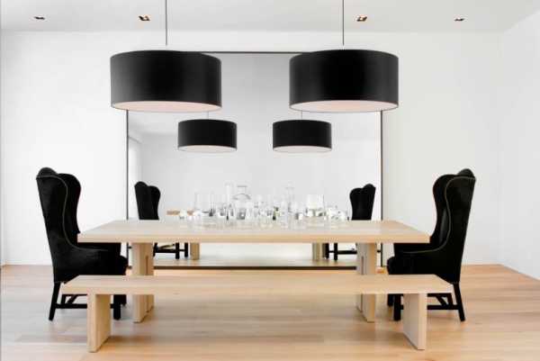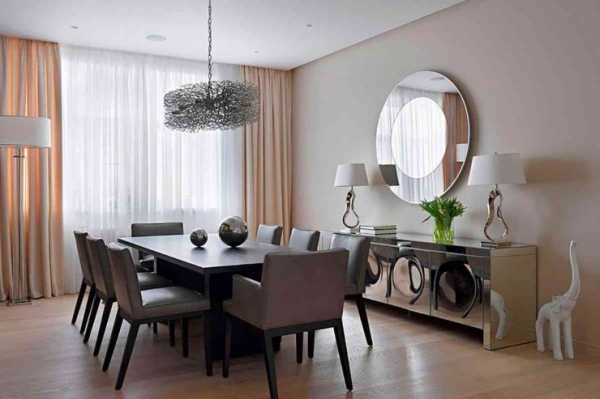 в данном случае зеркальная стена зрительно удлиняет площадь обеденного зала