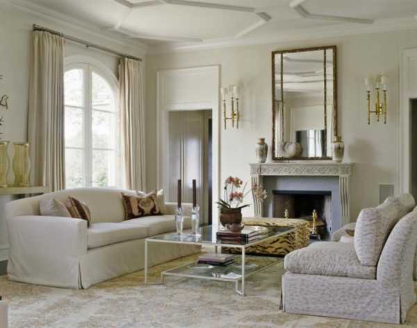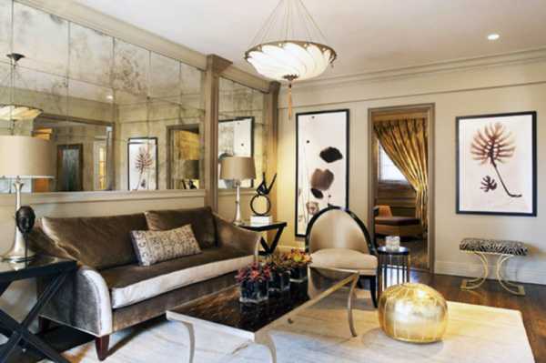 декор стены зеркалом визуально увеличивает пространство гостиной