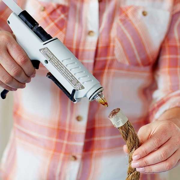 Изолента связывает вместе волокна каната, полностью покройте край горячим клеем. Прижмите край клеевого пистолета к волокнам, чтобы охватить все волокна. (Таким же способом вы будете обрабатывать другой край в следующих этапах).