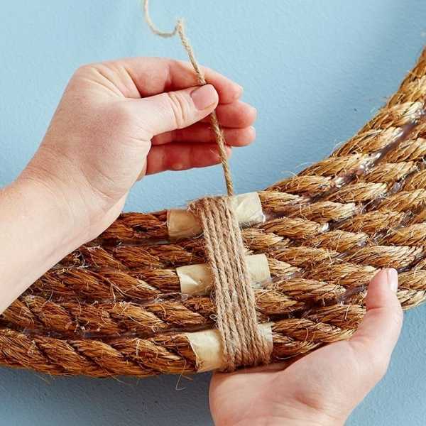 Чтобы скрыть склеенные концы каната, следует обвить джутовым шпагатом участки каната, обмотанные изолентой. Склейте шпагат с обратной стороны рамы из каната.