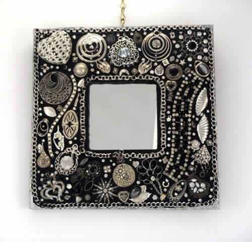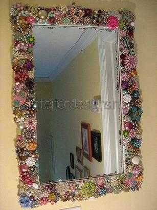 Такое зеркало однозначно украсит интерьер, да и увидеть свое лицо в таком обрамлении тоже приятно. В интернете огромное количество фотографий такого декора, и все они великолепны. Воплощение этой идеи зависит от наличия этих самых брошек, сережек в Ваших сундучках. А именно этот декор зеркала подразумевает использование цепочек, которые стоят совсем недорого в магазинах для рукоделия и швейной фурнитуры.
