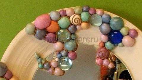 Кусочки приклеиваются универсальным клеем по заранее нанесенному рисунку, добавляются круглые фрагменты зеркала, и перламутровые камешки, бусины т.д.