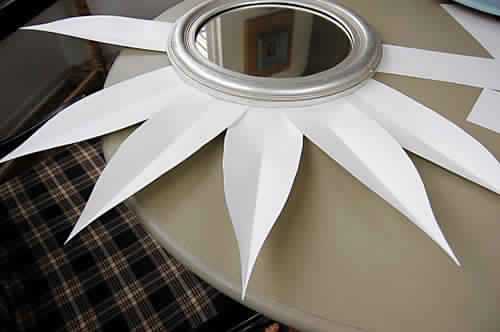 Можно нарисовать оригинальную рамку вокруг зеркала на стену, которая будет выделяться в комнате и станет ее своеобразной изюминкой. Помимо этого в декоре круглого зеркала можно использовать многослойную ажурную салфетку, имеющую красивый узор по краям. Для этого понадобиться приобрести двухсторонний скотч, с его помощью нужно будет симметрично закрепить салфетку на стене.