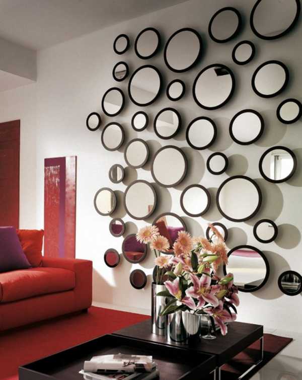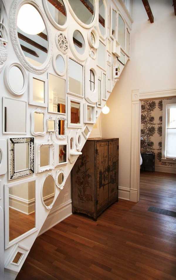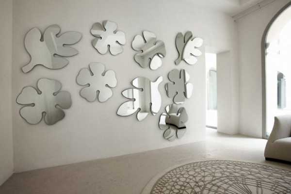 коллаж из небольших зеркал различных размеров придают интерьеру неповторный и оригинальный стиль