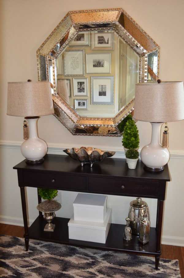 Распространенный прием при декоре стены зеркалом – расположить его так, чтобы в нем отразились люстры, бра или абажуры торшеров. Помещая зеркало возле тумбы или декоративного столика, стоит позаботиться, чтобы в нем отражалась, например, ваза с цветами или красивый подсвечник с зажжёнными свечами. Такие способы оформления дизайна не смогут не впечатлить.