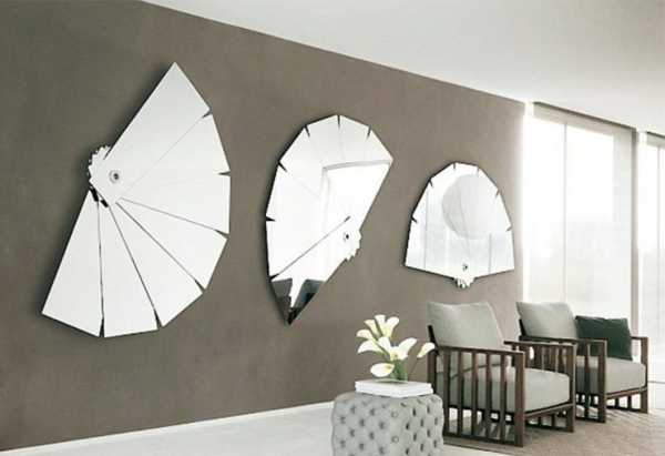 Кроме мелких зеркальных элементов, составлять настенные композиции можно и из больших зеркал, причем в данном случае совсем неважно, какой формы, в каком обрамлении и какого размера они будут. Удачно собранная картина из зеркал просто не может остаться незамеченной.