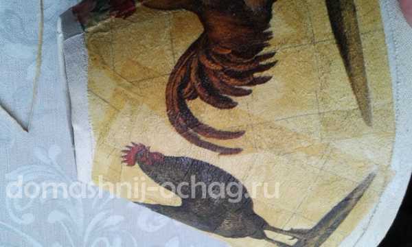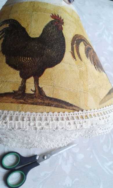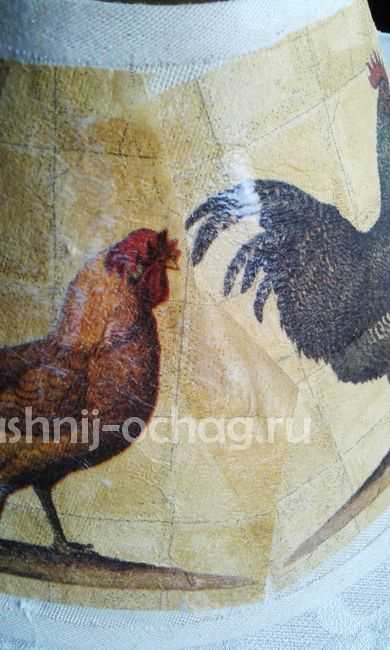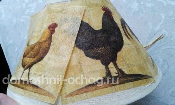 9. Поскольку абажур имеет вид конуса, приклеить фрагменты салфеток в стык не получится. Поэтому перед наклеиванием второго рисунка сначала разместить фрагменты внахлест и обрезать лишний фон — при этом следить, что бы сам рисунок петуха или курицы не заходили друг на друга.