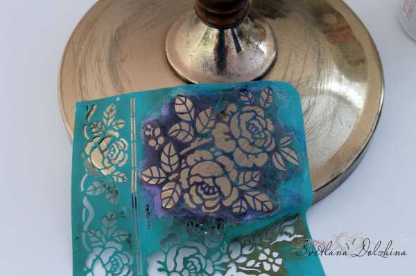 5. Далее оформляем основание лампы, где таким же образом приклеиваем цветочный мотив из декупажной карты и наносим кракелюрный состав.