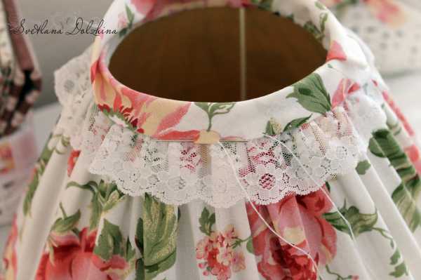 Низ абажура тоже украшаем кружевом, прошиваем его потайным швом.