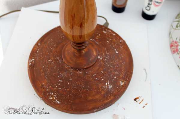 До новых встреч! P.S: Покажу свои промежуточные опыты с лампой. Сначала я решила ножку не красить, покрасить низ таким же цветом и сделать состаренный вид.