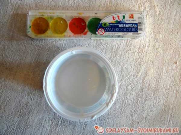 После грунтования я просто крашу абажур серой краской. Тут есть еще один маленький секрет: я колерую (добавляю цвет) краску обычной акварелью. Водой ее, конечно, не развожу, но добавляю кусочек акварели в краску и долго перемешиваю, пока цвет не становится однородным.