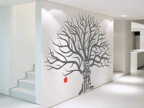 Однако данный вид отделки прослужит намного дольше (разумеется, это зависит от качества наносимой краски) и выглядит гораздо более солидным. К тому же, трафарет можно создать собственными руками. Для того, чтобы создать такой декор, как дерево на стене, применяются экологически чистые краски на водной основе, чаще всего акриловые, поскольку они быстро высыхают, к тому же не имеют запаха.