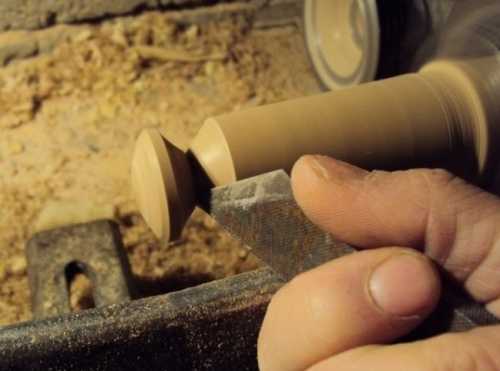 - Далее зажимают обтесанную заготовку на токарном станке и с использованием стамески формируют цилиндр.