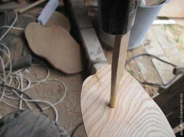 Точки соприкосновения основы и ручки нужно обязательно усилить нагелями. Поэтому просверливаем отверстия через основание в ручку под небольшим углом и загоняем туда нагели, тоже смазав их клеем.