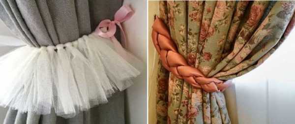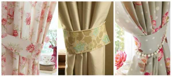 Подхваты из шелковых, капроновых и атласных лент и разнообразной декоративной тесьмы тоже можно подобрать под любые шторы. Ими удобно драпировать ткань без заломов и смятия. Чтобы изготовить такой подхват не требуется швейных навыков. Достаточно отрезать полоску необходимой длины и парой стежков закрепить ее на занавеске.