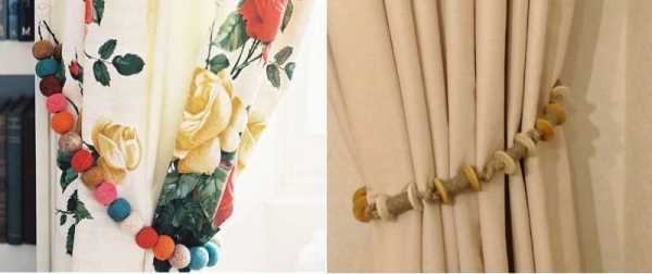 В дополнении ко всем известным материалам могут использоваться другие декорирующие элементы. Например, очень популярны бусины, ленты, банты, бисер, рюши, даже пуговицы. Все они делают подхваты красивее, разбавляя комнату яркими идеями.