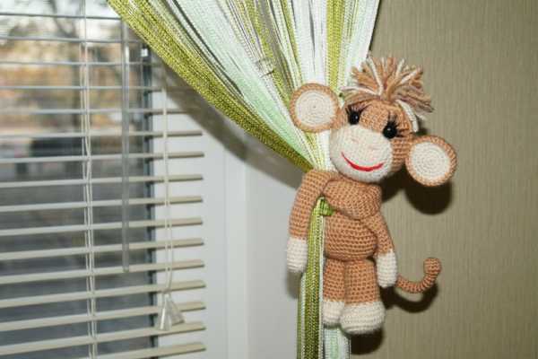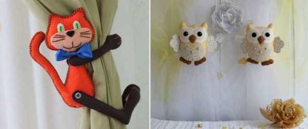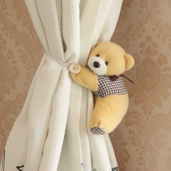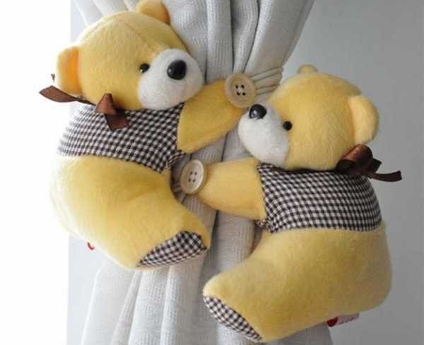 Милые игрушки из фетра или плюша, обнимающие занавески ― идеальное оформление подхватов для штор в детскую. Они могут быть драпировать ткань, удерживая ее длинными, завязанными в узел лапками, хвостом, в который вставлена проволока, пришиваться на полоску для штор из атласной ленты, крепится на магнитные держатели, пуговицы.