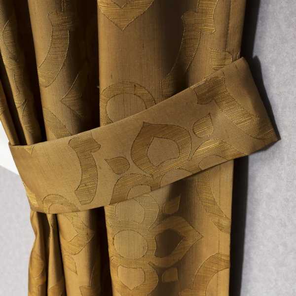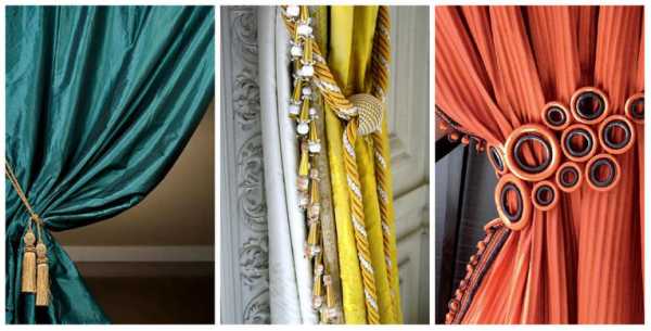 Аксессуары сложной формы, ярких расцветок, украшенные блестящей фурнитурой, подходят для гладкокрашеных занавесок. Для портьер из набивной ткани со сложным рисунком лучше использовать простые подхваты из той же ткани или шнуров с кистями.