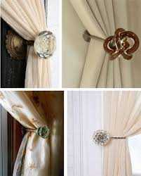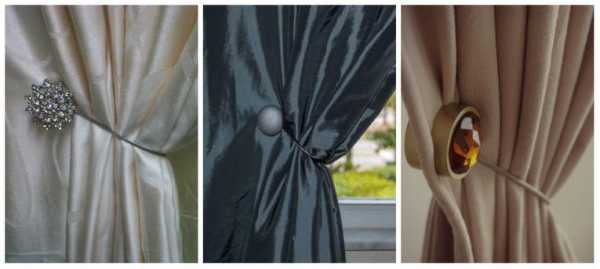 Очень популярны держатели на магнитах. Ими удобно декорировать не слишком плотные занавески. Вшитые или открытые магниты располагаются на концах подхватов, в качестве которых используются ленты, тесьма, гибкие декоративные тросы, витые шнуры. Сами магниты украшают в любом, подходящем для интерьера стиле, от забавных пластмассовых смайликов до гламурных хрустальных страз.