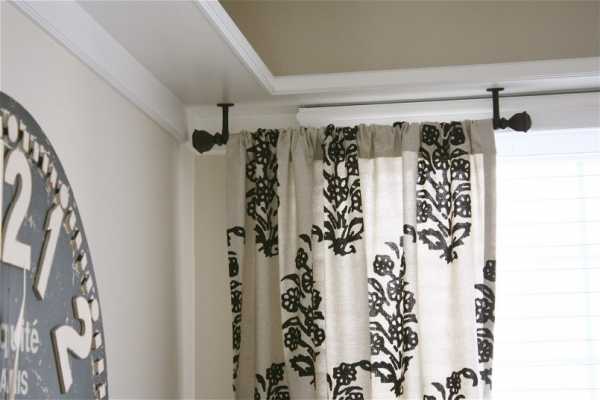 - Держатели, установленные на 25-35 см ниже уровня подоконника, визуально делают проем уже и выше. Этот способ особенно актуален, когда окна украшают тяжелыми портьерами до пола или стелящимися по полу.