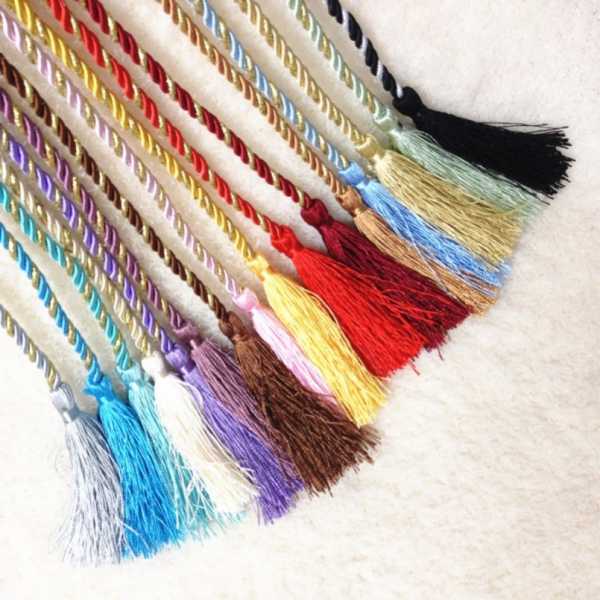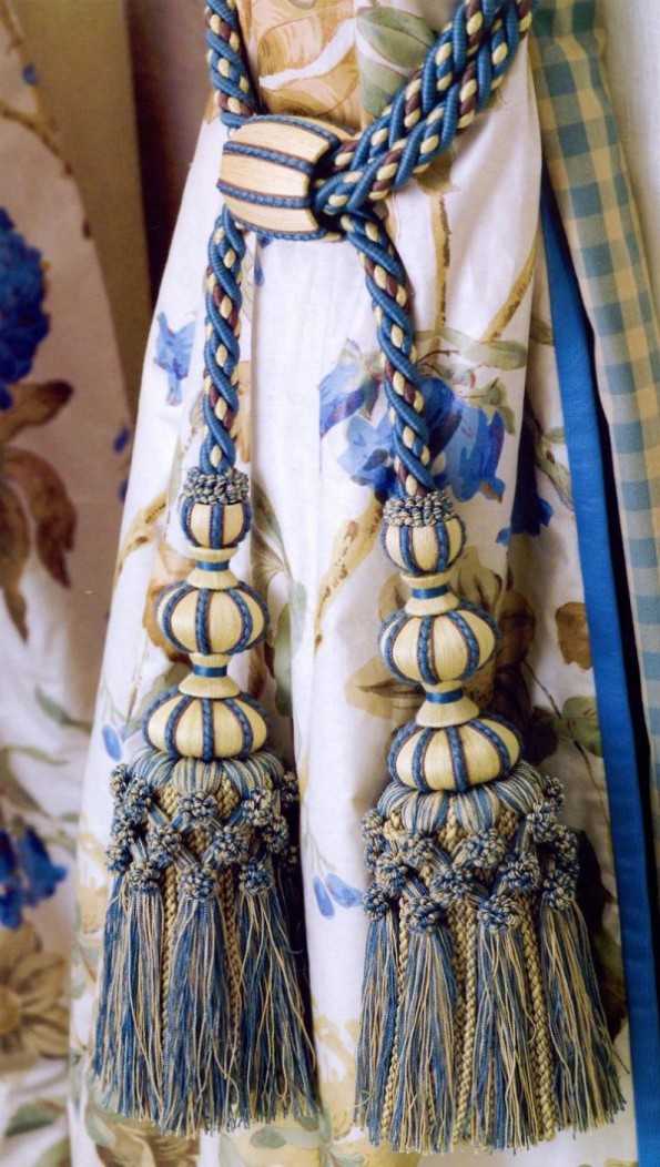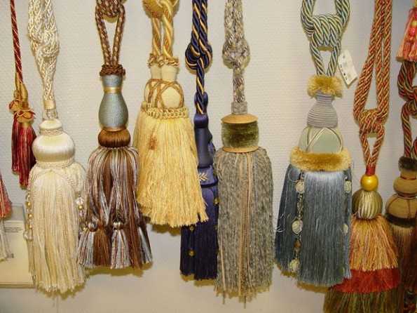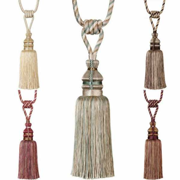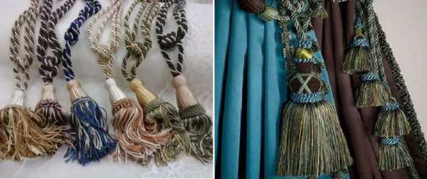 Разноцветные витые шнуры с кистями ― благородное статусное украшение. Особенно хорошо они смотрятся на изысканных элитных тканях: парче, бархате, велюре, плотном шелке. Задрапировать с их помощью тяжелую ткань просто ― достаточно перевязать ее словно поясом в нужном месте. Часто всего такие портьеры однотонные и насыщенного цвета, а шнуры оживляют их монотонность.
