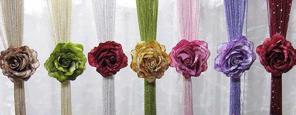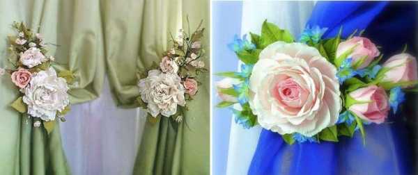 Как и канзаши подхваты для штор из фоамирана от остальных моделей отличаются не конструкцией, а особенными украшениями. На них пышно распускаются великолепные цветы, выполненные руками опытных мастериц, почти не отличимые от настоящих.