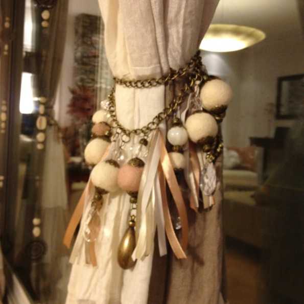 Подхваты для штор из бусин подойдут для однотонных или с бледным рисунком занавесок в спальне и гостиной. Они изысканно выглядят, создают камерную, умиротворяющую атмосферу. Для создания подхватов для штор из бусин можно взять уже готовую бижутерию или собрать их самостоятельно, используя не только бусинки, но и стразы, бисер, всевозможные декоративные цепочки, гармонирующие по текстуре и цвету с дизайном комнаты.