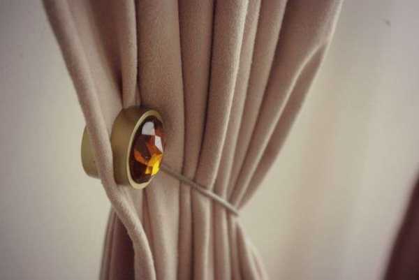 Модели для штор на магнитах идеальный вариант того, как крепить легкие ткани. Магниты в оболочке (от забавных пластмассовых смайликов до полудрагоценных камней) вшиваются на концы прихватов из лент, декоративных тросов или витых шнуров. Самые популярные магниты для штор ― металлические или пластиковые изделия простой геометрической формы (круглые, овальные, ромбовидные), однотонные, с рисунком, украшенные стразами или обтянутые тканью.