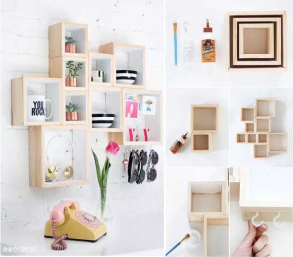 В магазинах для творчества часто можно встретить деревянные полые кубы разных размеров. Из них можно сделать отличное полко-семейство для всяких разных мелочей. Иногда подобные кубы можно найти в строительных магазинах. Они отлично соединяются между собой при помощи клея для дерева. А сколько простора для интересного окрашивания!