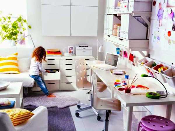 Игрушки должны быть самых безумных и ярких цветов. Они удобно располагаются повсюду – на полочках, на полу, на подоконнике, у двери, на стуле. Игрушки играют роль цветовых пятен и в детской вполне уместно устроить праздничный карнавал цвета. Здесь можно себя не ограничивать и дать волю своей фантазии. Помимо этого, яркие игрушки скрывают беспорядок в комнате, что очень актуально для малышей.