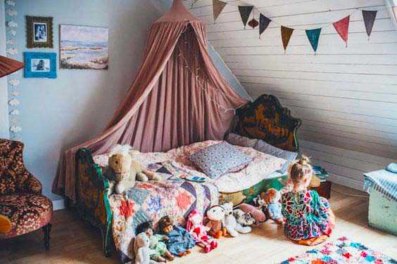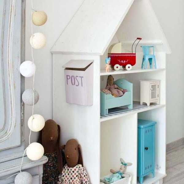 Предпочтительно сделать так, чтобы мебель в комнате занимала меньше места. Поднятая на второй ярус детская кроватка, под ней письменный стол или место для игр – хорошая идея. Кровать можно оставить и на полу, но придумать, как оформить ее красиво, оригинально. К примеру, соорудить над ней балдахин, превратив в шалаш, или крышу, сделав внешне похожей на уютный домик. Шкаф можно сделать в форме домика, в нем «поселить» детские игрушки, «выглядывающие» из окошек.